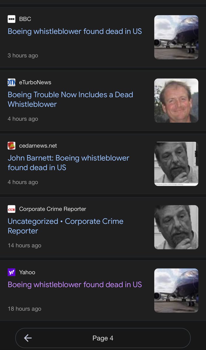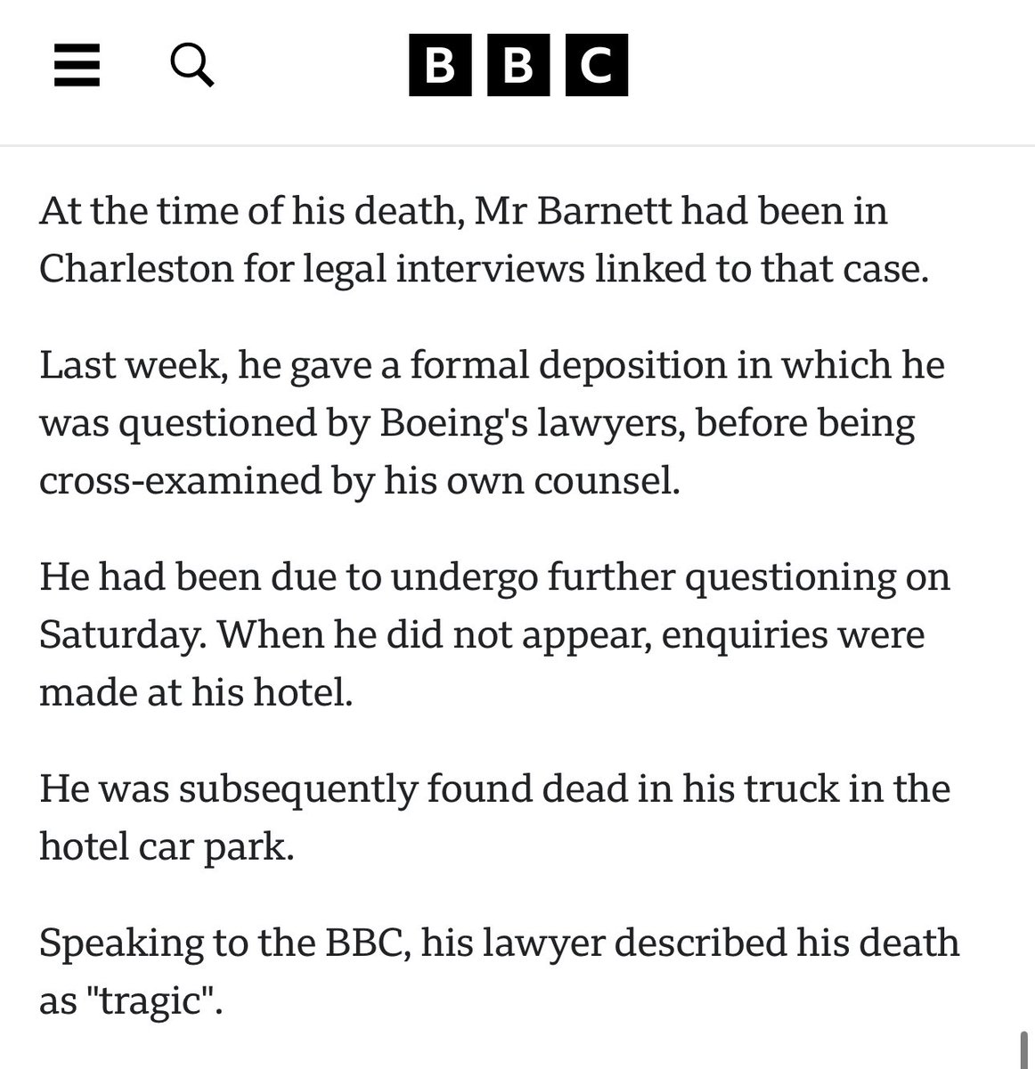 2) WTF — “It said the 62-year-old had died from a "self-inflicted" wound on 9 March and police were investigating.” ➡️ people don’t suddenly commit suicide in a parking lot while at a hotel to testify against @Boeing for days and days.