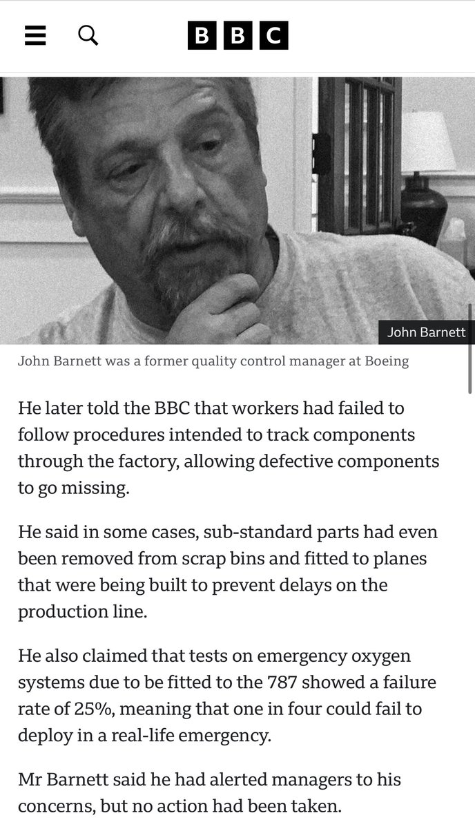 ⚠️HOLY SMOKES—A famous whistleblower against @Boeing on safety issues, has just been suddenly found dead in his truck in his hotel parking lot—all while **testifying in the middle of his week of depositions** against Boeing. JFC. Many of John Barnett’s claims about dangerous Boeing practices have already been verified by the FAA. If we don’t hold accountability for his death, whistleblowers won’t come forward in the future—which would endanger publicly health & safety. https://bbc.com/news/business-68534703
