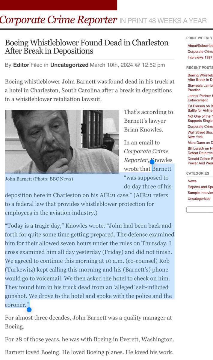 7) Folks—John Barnett worked at @Boeing for 28 years. He is not an attention seeker. Yet federal whistleblower protection wasn’t enough to protect him during his testimony. We live in a dangerous world folks. Whistleblowers need better protection. https://www.corporatecrimereporter.com/news/200/boeing-whistleblower-found-dead-in-charleston-after-break-in-depositions/