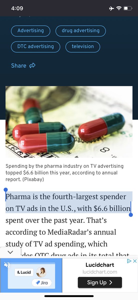 This was in 2019... It's only gone up. The HARMAceutical industry controls 90% of advertising space in the US now. https://www.fiercepharma.com/marketing/hey-big-spenders-pharma-ranks-top-five-industries-for-tv-media-spending-says-report