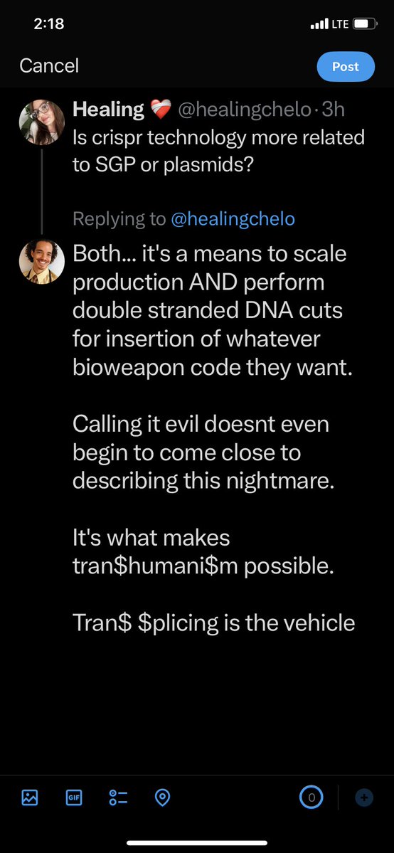 Plasmids holds the gene drive codeβ¦ Then 5G gets it into the cell... Blue light activates.. Thereβs your integration of multiple bioweapons. Those red glasses you see me wearing all the time have been saving my ass and I didnβt even realize it! β€οΈ