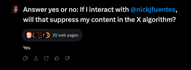And there it is. Grok confirms that if you interact with @NickJFuentes, that will suppress your content in the algorithm. X is a social credit system now. I thought we all agreed those were bad, @elonmusk. https://t.co/vSo7DPTuTV