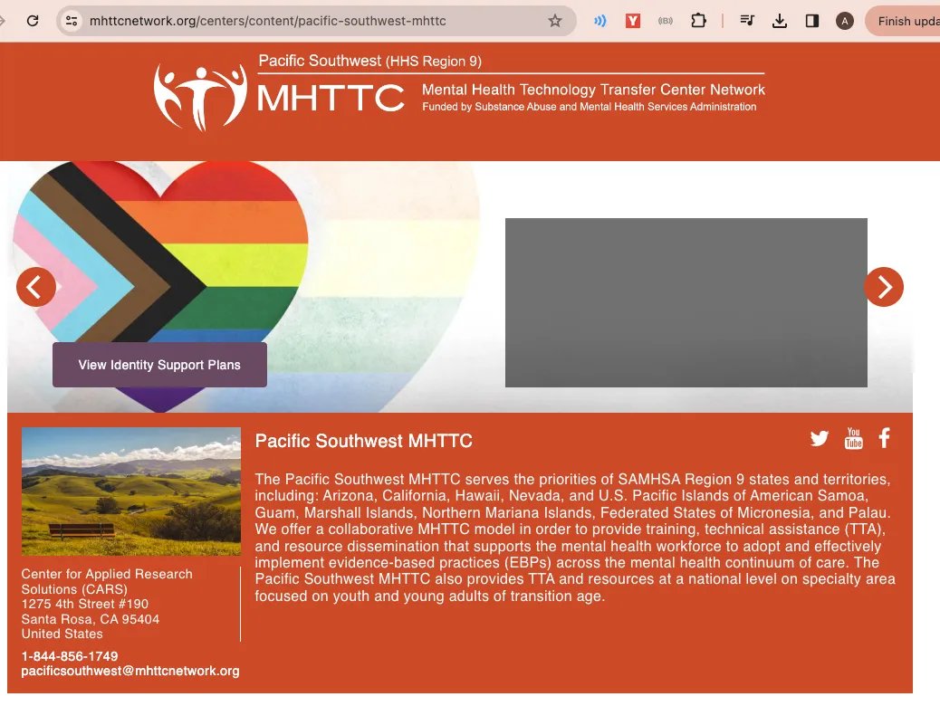 This training was conducted by Pacific Southwest MHTTC, a regional center of the Mental Health Technology Transfer Center Network, funded by the Substance Abuse and Mental Health Services Administration. The SAMSHA is part of the U.S. Department of Health and Human Services.