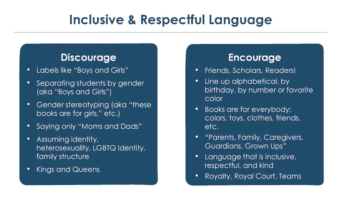 Also in the training, they taught teachers to eliminate all gendered language like "boys and girls," "mom and dad," and even get rid of homecoming "kings and queens"