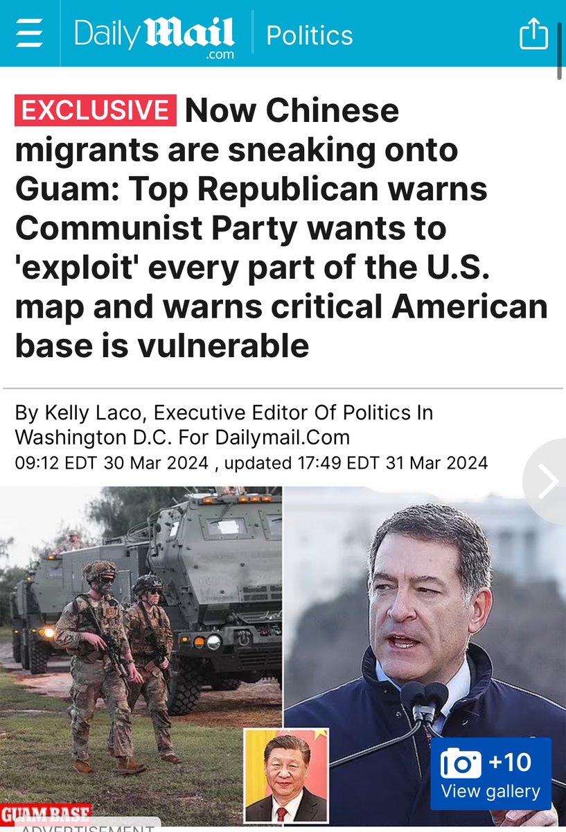 Remind that 4 month ago, I pointed out that certain journalists in MSM promoted propaganda to whitewash the military-age illegal migrants entering 🇺🇸 via Guam in CCP’s Trojan Horse plan. Now it’s more seriously!👇🏻 https://www.dailymail.co.uk/news/article-13249963/chinese-migrants-guam-republican-ccp-exploit-military-base.html • A growing number of Chinese nationals have been sneaking in from the Northern Mariana Islands into Guam • Guam's homeland security agency reported 118 'unlawful or attempted unlawful entries by Chinese citizens' since 2022 • That makes the U.S. territory hosting 20,000 susceptible to CCP influence.