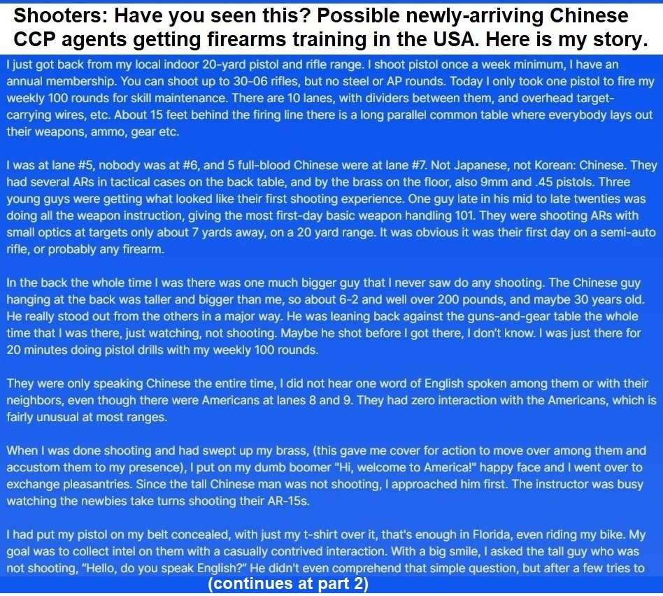 It’s very serious! To note, people from 🇨🇳 usually have no interest in guns because it’s not allowed to bear arms there. CCP’s propaganda makes Chinese fear of guns. Therefore, it’s unexplainable that 🇨🇳 illegal migrants always go to practice and buy guns, soon after arriving in 🇺🇸! What’s their motives? What’s their purposes? #UnrestrictedWarfare