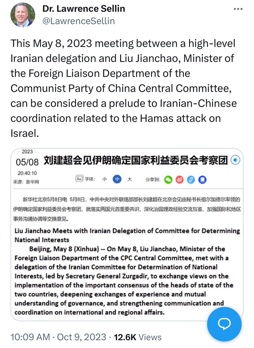 (Continue: EXCLUSIVE CLASSIFIED INFO from our sources in Central CCP @lude_media) 4. WHO is the direct contact between Xi Jinping’s Office and Khamenei’s Office • The direct contact on behalf of Khamenei is the Director of Executive Office of The (Chief) Secretary Office in Expediency Discernment Council of Iran. • Based on Chinese translation by CCP, his name is likely Sayyid (some middle name) Javaheri (or zawahiri). 赛义德.埃赫山.贾瓦赫里 伊朗确定国家利益委员会秘书长办公室执行处处长 • The delegation of Expediency Discernment Council of Iran has visited Beijing to meet Head of CCP’s International Liaison LIU Jian-Chao on 8 May, 2023.