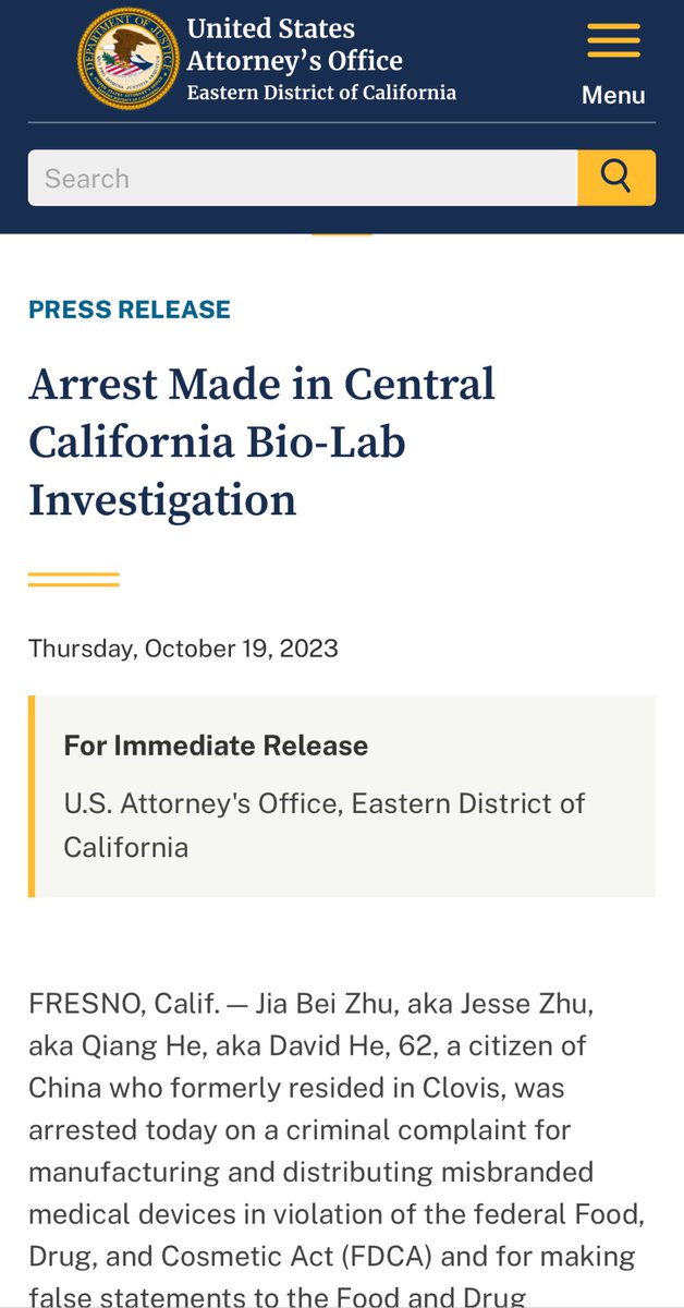 Wow! Jesse Zhu is arrested!👍 Publicly, I’m the first to discover that Jesse Zhu (Jia Bei Zhu 祝加贝) is the CCP’s agent leading the whole transnational business groups, including the dangerous 🇨🇳 bio-labs (PBI and UMI) in CA. It’s definitely more than a sloppy bio-lab. At that time, an @AP article claims it is “anti-Asian” to investigate the secret criminal connections between the bio labs in CA and CCP! Pure propaganda! https://www.justice.gov/usao-edca/pr/arrest-made-central-california-bio-lab-investigation