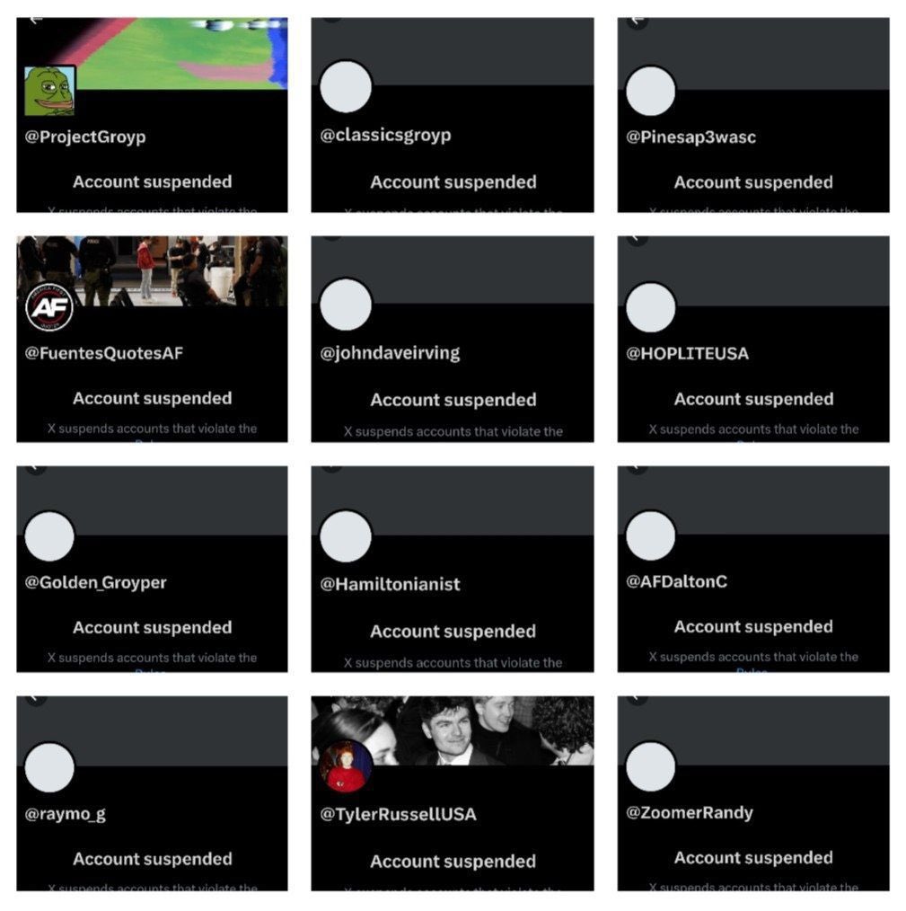 Elon Musk (@elonmusk) is now MASS BANNING every account who was affiliated with Project Groyper, regardless of content they posted!!! This is the worst censorship of free speech, we've ever seen!! @NickJFuentes https://t.co/1Huiqwdjb0