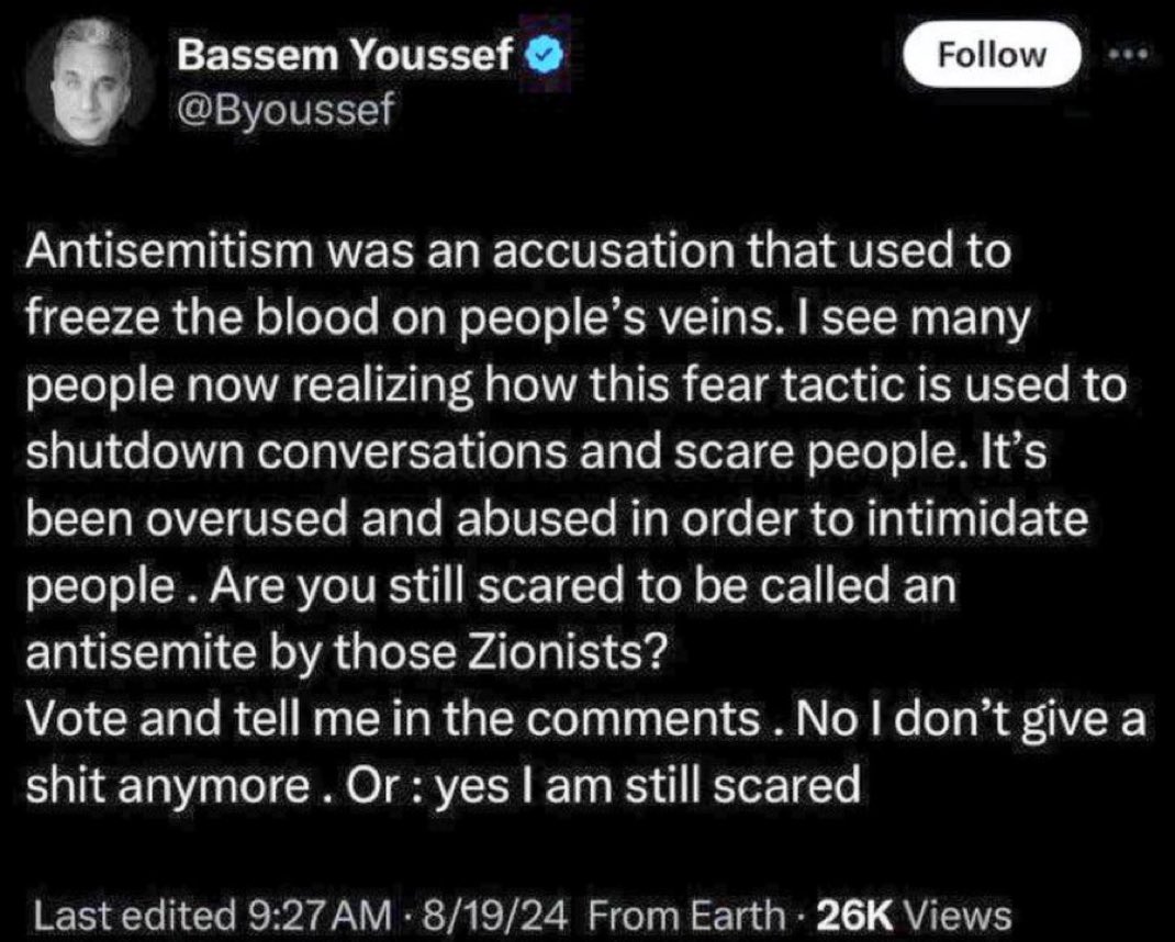 This was the last post by Bassem Youssef before his account with 11.7 million followers was shut down. https://t.co/R5blwH0SEg