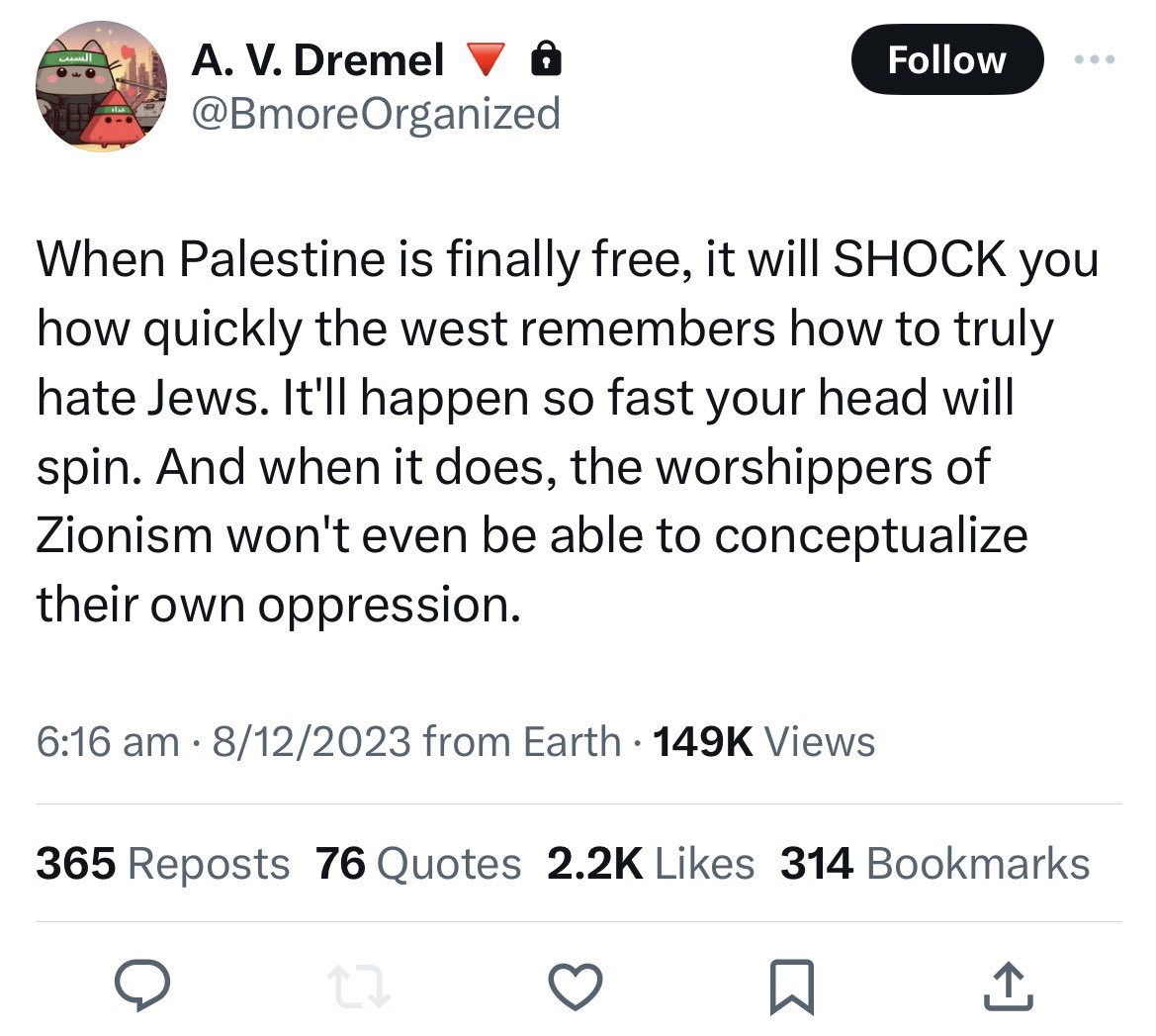 Hamas supporter: โFreeing Palestine will ensure no Jews are safe anywhere.โ This is what does serious damage to the Palestinian cause. Idiots like this who gleefully boast online about future anti-Semitic revenge killings and massacres https://t.co/43IQKMChDu
