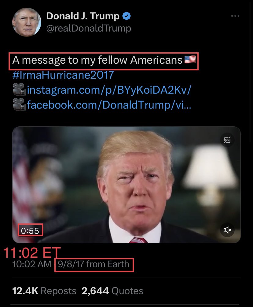 Uhh… guys… You’ll want to pay attention to this one. So tomorrow will be a 6 year delta… My mind is blown right now… See the :55 in the clip? Well there’s a problem with that… See the video? It’s 74 seconds long… It’s 6 years tomorrow… It’s My fellow Americans… It was on Twitter the whole time… Please tell me you see this. https://x.com/realdonaldtrump/status/906170854362447875?s=46&t=oyyZ7zvKBg1CAFh2JK9OFA…
