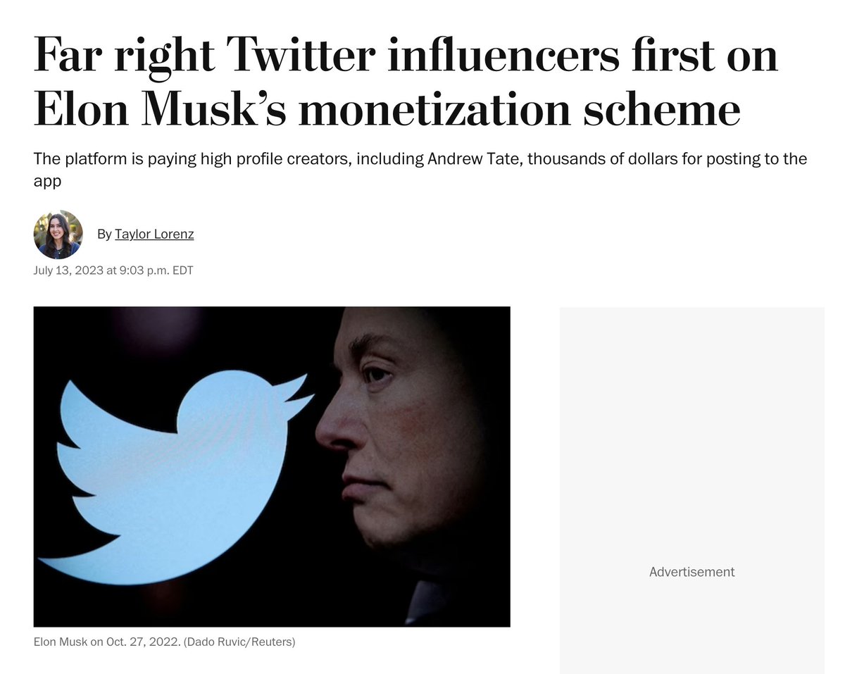 I want to address some things regarding Taylor Lorenz's Washington Post story. 1) I support most of her reporting. 2) Her story entitled "Far right Twitter influencers first on Elon Musk's monetization scheme" is a terrible piece of journalism 3) The article states, "On Thursday Twitter announced that it would begin sharing ad revenue with content creators." Fact is, this announcement actually came back in February. I specifically remember it as do many others. 4) Her article goes on to claim, "The first beneficiaries appear to be string of high profile far right influencers who tweeted before the announcement how much they’ve earned..." Again, this is factually incorrect. Twitter sent out notifications to those receiving money at around 12:42PM ET on Thursday. The first person tweeting about being paid was Ashley St. Clair at 1:04PM ET, followed by Benny Johnson at 1:14PM ET and then many others. All of the influencers were not "far right influencers," unless you consider myself and Brian Krassenstein to be "far right." We both received more than any of those individuals mentioned in Taylor's article. Mr. Beast ($25K) also received about the same as Brian and I. He definitely is not "far right." 5) At the time of Taylor Lorenz's article, several left-leaning people had already tweeted that they were paid, including ourselves and Katherine Brodsky, but she claims in the article that "So far, the influencers who have publicly revealed that they’re part of the program are prominent figures on the right." At the time, Brian's tweet about his payment had already received over 5 million impressions. This article was very bad reporting on behalf of the Washington Post and Taylor Lorenz, and that's coming from someone who normally likes the WaPo.