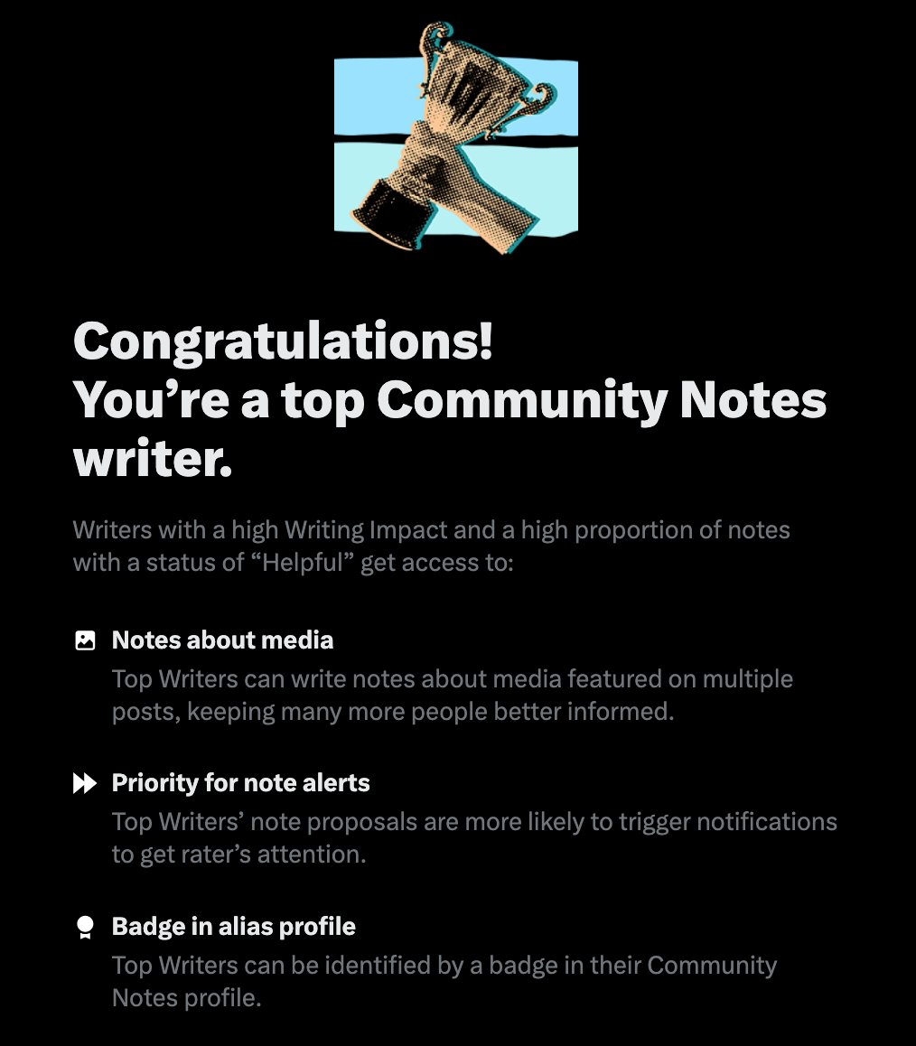 I'm proud to say that I play a role in Writing and Rating X's Community Notes, and I've just been awarded the "top community notes writer" designation. https://t.co/ssGHp6ewCw