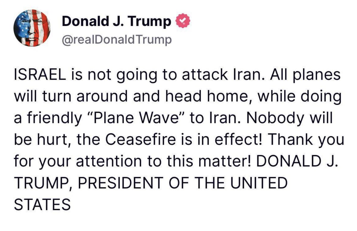 Israel literally dropped a bomb on Iran as Trump was typing this message: https://t.co/NwaAy7xYde