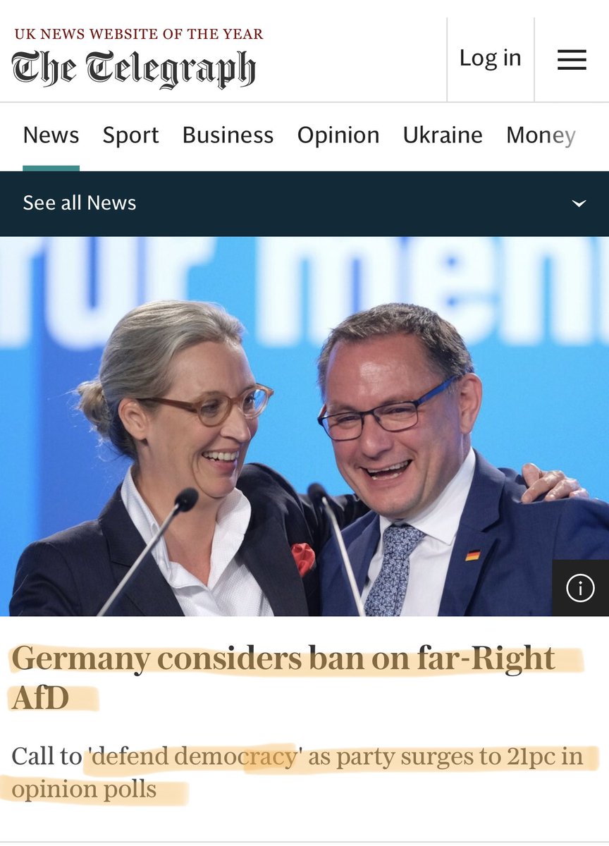 GERMANY- Falling into dictatorship as the ruling party looks to BAN its greatest threat, by calling the AfD a threat to democracy’ The AfDis polling at 21% But the people cannot be allowed to choose the ‘wrong’ leaders. Banning the opposition? This should scare you