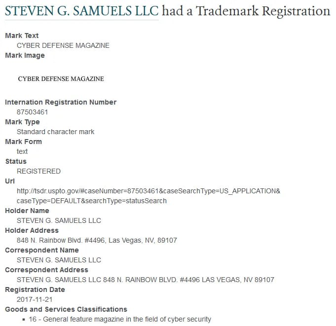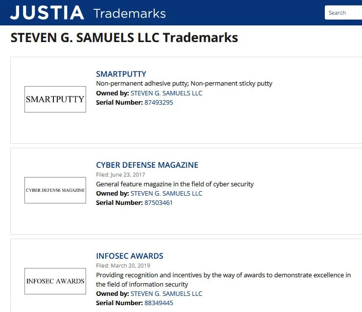 In fact, Steven G Samuels LLC holds the trademarks for Cyber Defense Magazine, which were filed on June 23, 2017, and InfoSec Awards, which were filed on March 20, 2019. https://trademarks.justia.com/owners/steven-g-samuels-llc-3586077/
