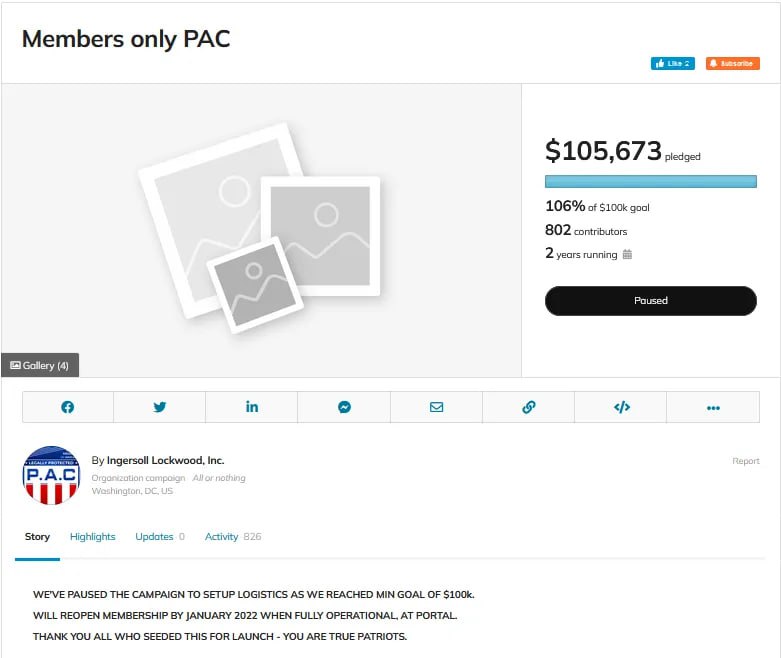 Here is a link to the web archive of Ingersoll Lockwood's website on January 27, 2022. https://web.archive.org/web/20220127171434/https://www.ingersolllockwood.com/ Here is a link to the web archive of Ingersoll Lockwood's website on February 22, 2022. https://web.archive.org/web/20220222165542/https://www.ingersolllockwood.com/ Here is a link to the web archive of Ingersoll Lockwood's website on March 24, 2022. https://web.archive.org/web/20220324032856/https://www.ingersolllockwood.com/ As far as I can tell, there was no official announcement or update made on the Ingersoll Lockwood. If it is there, I cannot find it. There was a website launched. Here is an archived link to it. And if you click on the donate button, you will see this. Excerpt: DONATE Thank you for supporting the mission of Peaceful American Constitutionalists (MemberPAC). We encourage you to become a member by selecting the Join Button above, but if for any reason you prefer to support MemberPAC without a membership, you are certainly welcome to do so. Suggested Sponsorship Opportunities (You can choose to receive recognition or remain *Anonymous at any level of support.) $100 General Support $250Β Support for Specific Constitutional Issue $1000Β Support for Class Action Costs $1500 Support for White Paper on Specific Constitutional Issue $2500 Support for Case Filing, such asΒ Amicus CuriaeΒ Briefs (Larger Donations Are Welcome)$5000 Support for Single Webcast on Specific Constitutional Issue $10,000 Support for Webcast Series on Specific Constitutional Issue $_________ Other AmountΒ Support for Specific Project or General PAC Mission Β Β Β Β * Notice to Donors and Sponsors: Β Β Β Β Β Β Β Β Β Β Β Β Β Β Β Β Β Β All donations and sponsorships go directly to the mission of P.A.C., but are not deductible as charitable donations. https://web.archive.org/web/20220624015017/https://www.memberpac.com/ https://web.archive.org/web/20220624014943/https://www.memberpac.com/Donate