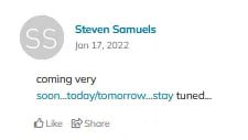 A single message was left on January 17, 2022 by Steven Samuels. "Coming very soon... today/tomorrow... stay tuned..." https://fundrazr.com/membersonlypac?ref=ab_9lHA9nnYhez9lHA9nnYhez