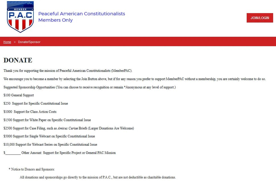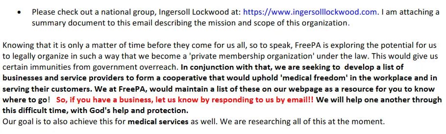 However, if you look on Open Secrets, you will find no PACs for Ingersoll Lockwood, Steven G. Samuels, or Peaceful American Constitutionalists. In fact the only time this so-called PAC comes up is from a newsletter coming out of Lancaster County in Pennsylvania. Here is the October, 2021 Notes and Calls To Action for the FreePA Lancaster County Chapter. At the top of the email, you will see "FYI re: health/pharmacy info..." Please check out a national group, Ingersoll Lockwood at: https://www.ingersolllockwood.com. I am attaching a summary document to this email describing the mission and scope of this organization. Knowing that it is only a matter of time before they come for us all, so to speak, FreePA is exploring the potential for us to legally organize in such a way that we become a 'private membership organization' under the law. This would give us certain immunities from government overreach. In fact, it isn't a PAC. It is a "private membership organization." Does this so-called PAC support any candidates? https://s3.documentcloud.org/documents/21096462/102821-meeting-notes.pdf