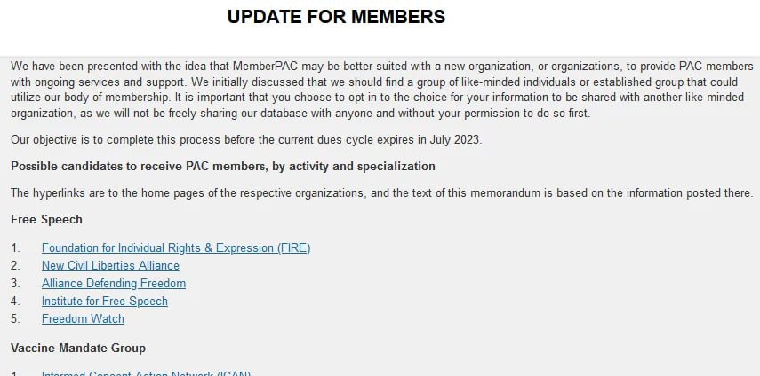 What happened to the $105,673 that was donated? How much money was ultimately donated? There is no PAC or 501(c)(3) listed anywhere. If this was to be open-book and transparent, then where is the transparency? Or was that just to people who opted in and became members? The web archive to the MembersPAC is here with a link for members to login. However, the live website is now defunct. Here is the last archived version of that website where they announced they were closing the MemberPAC by July 2023. https://web.archive.org/web/20230313081852/https://www.memberpac.com/