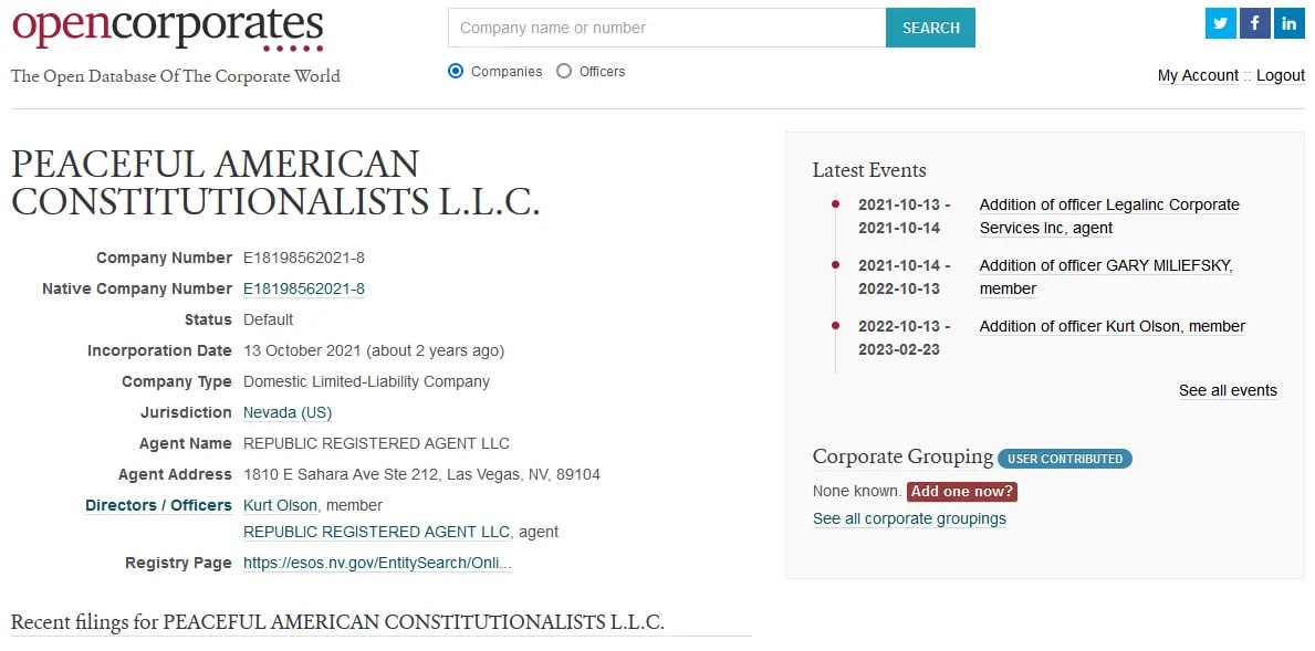 I will note that normally I would not be concerned about this. It was a service offering Legal Shield. However, I found something that has given me grave concerns. If transparency was an issue, where is the transparency? And why all the continuous never-ending games? Don't you think we are due some straightforward answers for once? Here is the link to the corporate filing for Peaceful American Constitutionalists. While it doesn't share the same addresses as other corporations that Gary Miliefsky is involved in, he is listed as an officer. https://opencorporates.com/companies/us_nv/E18198562021-8