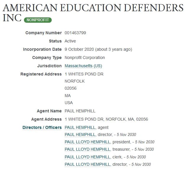 American Education Defenders Out of all of Ingersoll Lockwood partners, this one seems the most normal. I highlight this because shows exactly what transparency should look like. Where the MembersPAC lacked transparency, American Education Defenders made up for it. Granted, we are talking about the difference between a non-proift and a for-profit company. American Education Defenders is a non-profit 501(c)(3)that provides resources for homeschooling families, particularly through a video series that includes true stories from American history. Key employees includes: - Paul Hemphill, who acts as President, Treasurer, and Clerk - Roger Gullo, Director - James Hogarth, Director - Paul Tusini, Director - Muriel Martel, Director - Joseph Sturbinski, Director Paul Lloyd Hemphill is an author most known for his book Inspiration For Teens, which was published on July 1, 2018. He has been a popular TV guest, speaker, and videographer. According to the website, he started American Education Defenders in 2020 in response to what was going on with American classrooms and students. Paul has 19 years as a college admission strategist. His other books include How To Win The College Game, Why You're Already A Leader, Planning For College, and Gettysburg Lessons in the Digital Age, amongst others. American Education Defenders mission is to "help our youth believe in themselves and their country. We do it by making student centered learning as our focus. Itβs learning that pays attention to how the student is affected, not how to conform to standardization or compliance. We use true stories from just one event in American history to carry our mission. They prove that your child can be independent, self-reliant, responsible,Β imaginative, determined, empathetic, honest, and motivated. These are all values that America stands for. It helps our youth to believe in themselves and their country." If you were wondering about where American Education Defenders was licensed to, since we are talking about addresses, it was registered here under Paul Hemphill's name. 1 WHITES POND DR, NORFOLK, MA, 02056 Sources: https://americaneducationdefenders.com/ https://projects.propublica.org/nonprofits/organizations/853152198 https://rumble.com/c/c-2672054/videos https://www.amazon.com/Inspiration-Teens-Paul-Lloyd-Hemphill/dp/1732197806 https://www.goodreads.com/author/list/7370915.Paul_Lloyd_Hemphill https://opencorporates.com/companies/us_ma/001463799