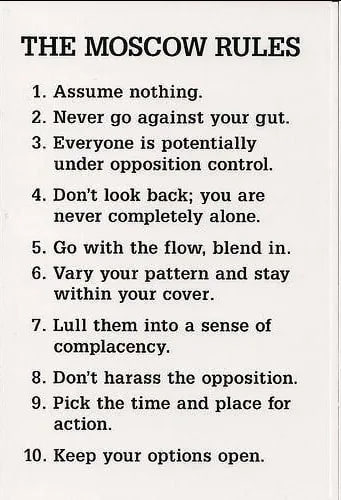 When I originally learned of them, this is the list I found. 1. Assume nothing. 2. Murphy is right. 3. Don't look back; you are never completely alone. 4. Everyone is potentially under opposition control. 5. Go with the flow, blend in. 6. Vary your pattern and stay within your cover. 7. Any operation can be aborted. If it feels wrong, it is wrong. 8. Maintain a natural pace. 9. Lull them into a sense of complacency. 10. Build in opportunity, but use it sparingly. 11. Don't harass the opposition. 12. There is no limit to a human being's ability to rationalize the truth. 13. Pick the time and place for action. 14. Keep your options open. 15. Technology will always let you down. 16. Once is an accident. Twice is coincidence. Three times is an enemy action. 17. Don't attract attention, even by being too careful. An agent lived or they died by these rules. It was just that simple. Other sources provide different versions of the CIAβs βMoscow Rulesβ. What all of them have in common, however, is the sense of ever-present danger that made them necessary in the first place.