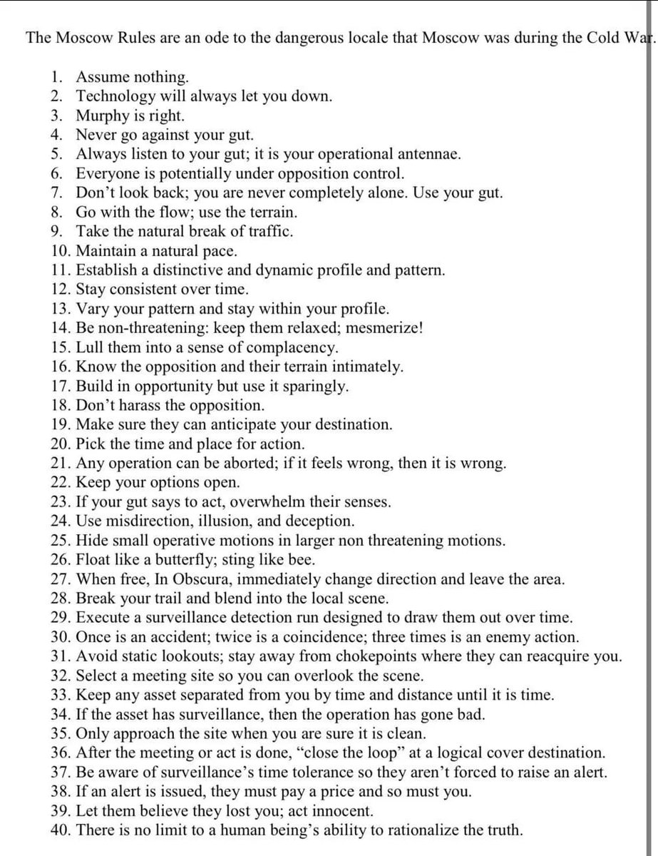 The Moscow Rules: From Cold War to Digital Battlefield #MoscowRules #5GWarfare Thread π§΅ A Common Sense Guide To 5th Generation Warfare The Moscow Rules: A History Lesson In the early years of the Cold War, it was common knowledge among CIA officers that Moscow was the most dangerous and challenging destination in the world... especially for clandestine operations and those who engaged in them. Within this harsh environment, CIA operatives developed a set rules of operation. These rules were designed to protect the agents and their sources in a cutthroat struggle with the KGB. They were unwritten and taught through word of mouth. But each agent knew them intimately by the time their feet touched Russian soil. The rules literally could make a difference in whether an agent lived or died, whether they would come home disgraced, or whether they would arise heroes. They became known as the βMoscow Rulesβ. https://en.m.wikipedia.org/wiki/The_Moscow_rules