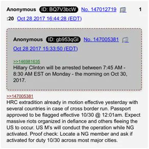 Q Posts October 28, 2017, a series of posts on an image board called 4chan appeared. The conspiracy theory was initiated by an anonymous user known as "Q". "Q" began posting cryptic messages, with the first ones concerning an imminent arrest of Hillary Clinton.
