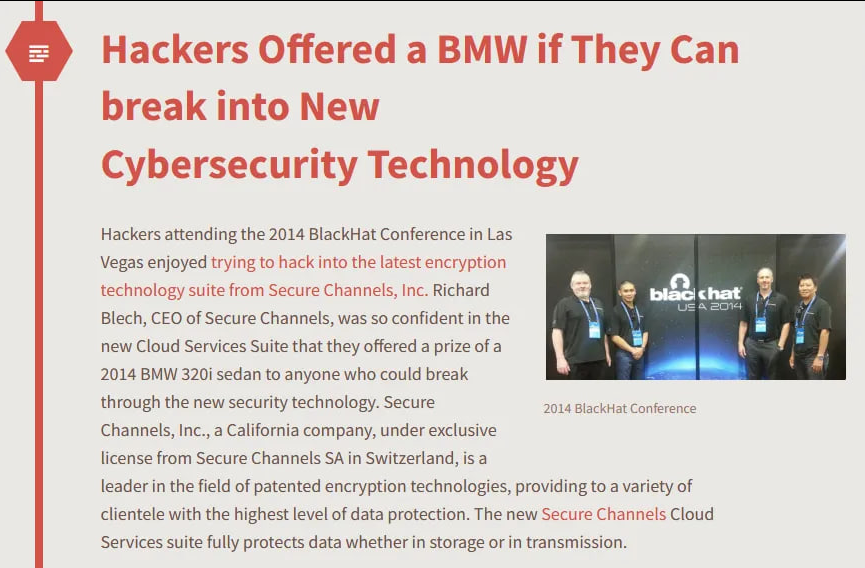 Here is the WordPress article written by Richard Blech: Hackers attending the 2014 BlackHat Conference in Las Vegas enjoyed trying to hack into the latest encryption technology suite from Secure Channels, Inc. Richard Blech, CEO of Secure Channels, was so confident in the new Cloud Services Suite that they offered a prize of a 2014 BMW 320i sedan to anyone who could break through the new security technology. Secure Channels, Inc., a California company, under exclusive license from Secure Channels SA in Switzerland, is a leader in the field of patented encryption technologies, providing to a variety of clientele with the highest level of data protection. The new Secure Channels Cloud Services suite fully protects data whether in storage or in transmission. WordPress: Hackers Offered a BMW if They Can break into New Cybersecurity Technology https://richardjblech.wordpress.com/tag/blackhat-conference/