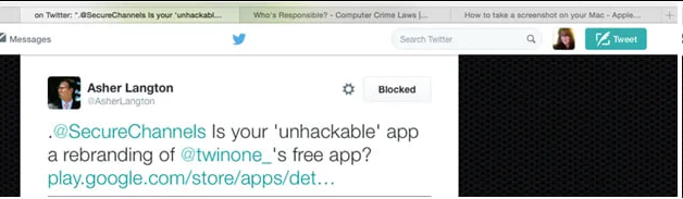 ... And The Harassment Campaigns Started When Lance James, a security researcher, tried to step up to Secure Channels Unhackable challenge, he was harassed by Richard Blech and Ross Harris, "a particularly aggressive member" of Secure Channels' sales team. When INFOSEC expert Asher Langton started calling out Secure Channels for being a fraud and pointing out a serious security risk, new Twitter profiles started attacking him. It turned out that one of these brand new anonymous Twitter accounts was Deidre "Dee" Murphy, the Director of Marketing for Secure Channels. These tweets claimed, among other things, that Asher Langton had engaged in criminal copyright infringement by posting up snippets of Secure Channels code. It turns out that Secure Channel's new unhackable app wasn't proprietary at all. It was a rebranded version of a free app.
