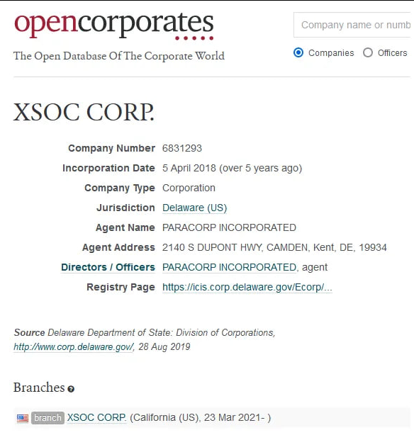 XSOC Corp And Addresses That brings us to April 5, 2018 and the creation of XSOC Corp. https://opencorporates.com/companies/us_de/6831293