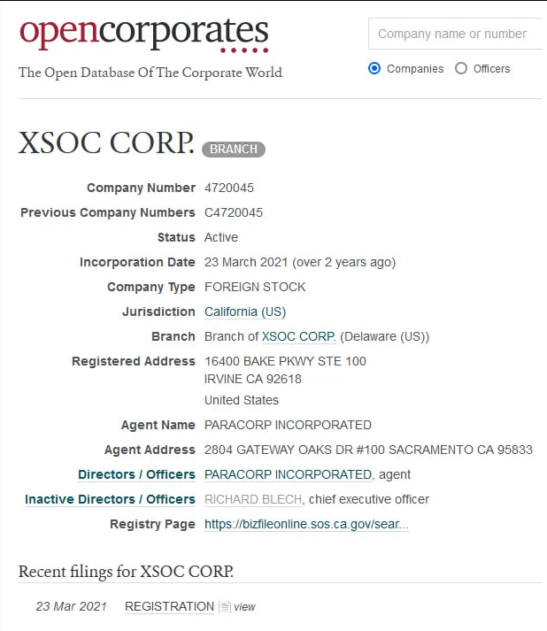 On March 23, 2021, the one branch of XSOC Corp in California was created. The registered address listed was: 16400 BAKE PKWY STE 100, IRVINE, CA 92618 United States https://opencorporates.com/companies/us_ca/4720045