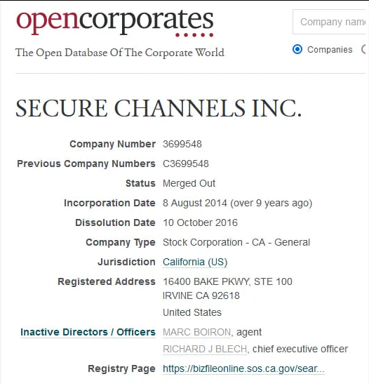 It was also the address for Secure Channels, Inc. 16400 BAKE PKWY STE 100, IRVINE, CA 92618 United States https://opencorporates.com/companies/us_ca/3699548