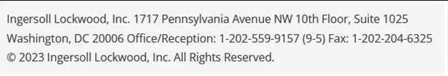 Isn't that the same address as Ingersoll Lockwood? Yes, it is. Ingersoll Lockwood, Inc. 1717 Pennsylvania Avenue NW 10th Floor, Suite 1025 Washington, DC 20006 Office/Reception: 1-202-559-9157 (9-5) Fax: 1-202-204-6325 Β© 2023 Ingersoll Lockwood, Inc. All Rights Reserved. https://www.ingersolllockwood.com/