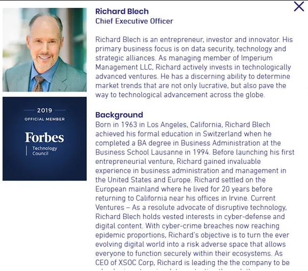 XSCOC Corp and Richard Blech Who is the CEO of XSOC Corp? Richard Blech. The same Richard Blech who was CEO of Credit Bancorp and Secure Channels Inc. The same Richard Blech who was labeled the mastermind behind the Credit Bancorp ponzi scheme by some newspapers. WARNING: If you go to their website, be sure you are blocking internet trackers. There seems to be a large number that keeps getting blocked. I have been blocking more than 40 per visit. I have maxed out at 100 blocked trackers per visit. XSOC Corp: Company Executive Team https://www.xsoccorp.com/company The Daily Record: Mastermind of Ponzi Scheme Pleads https://thedailyrecord.com/2003/02/06/mastermind-of-ponzi-scheme-pleads-123855/