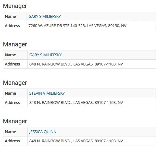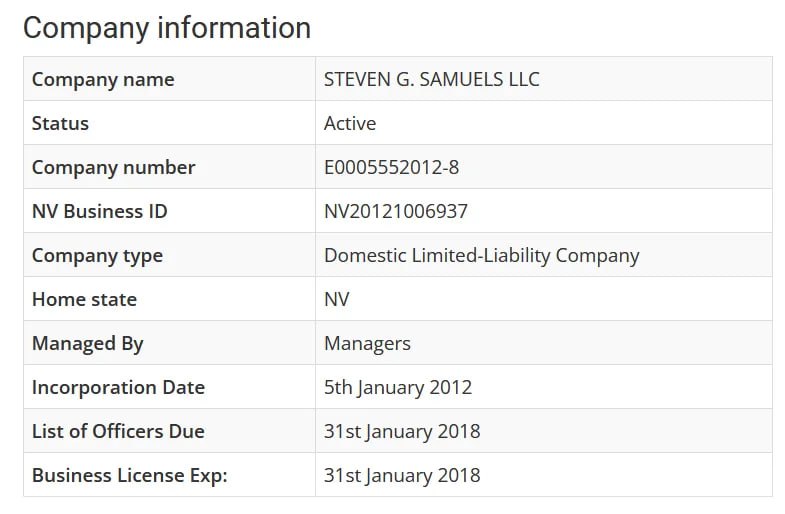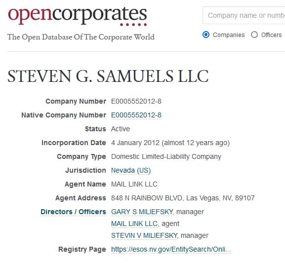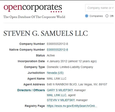 The company was registered in Nevada on January 5, 2012. The registering agent was MAIL LINK LLC. The officers are listed as Gary S. Miliefsky, Stevin V. Miliefsky, and Jessica Quinn. The two addresses given are: 7260 W. AZURE DR STE 140-523, LAS VEGAS, 89130, NV 848 N. RAINBOW BLVD., LAS VEGAS, 89107-1103, NV https://www.nevada-register.com/1092325-steven-g-samuels-llc