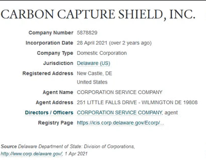 The registered address for Carbon Capture Shield is: 251 LITTLE FALLS DRIVE - WILMINGTON DE 19808 https://opencorporates.com/companies/us_de/5878829