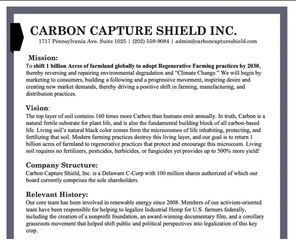 From their Carbon Capture Shield's Facebook page, I found a post explaining their mission statement and what they hoped to achieve. https://www.facebook.com/people/Carbon-Capture-Shield/100069436629267/
