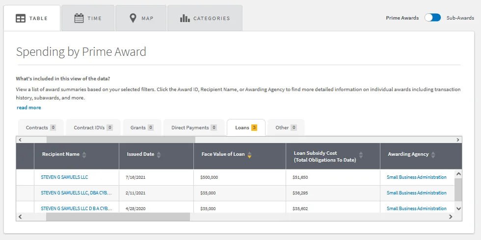 To further this, Steven G. Samuels was awarded government loans. They weren't from the Department of Defense. They all came from the Small Business Association for COVID relief and totaled $123,547. Two of them were for Steven G. Samuels doing business as Cyber Defense Magazine. https://www.usaspending.gov/search/?hash=70ec8f7cfe28b7961506cfd077d4ea8b