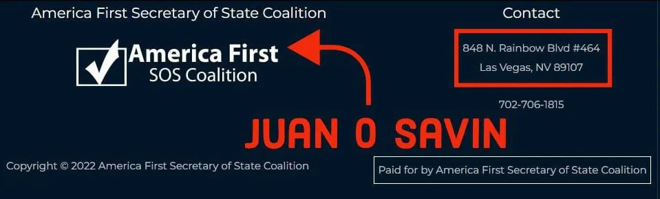 The Juan O Savin Connection And the Jaun O Savin connection? I nearly forgot to include that. Honestly, I came about that on happenstance. But I found other things I will explain at some time in the future which led me to believe there may be a bigger play here. The America First Secretary of State Coalition was the brainchild of Jim Marchant, the former Nevada State Representative. The idea was to put America First candidates in the position of Secretary of State in states who needed election integrity the most. From The America First Secretary of State Coalitions website: On May 1st, 2021 a truly eventful, even historic meeting was held in Las Vegas, Nevada. A private strategy session was arranged by former Nevada State Representative, Jim Marchant, who in February announced that he would be the Republican American First candidate for the office of Secretary of State, Nevada, in the 2022 elections. America First SOS Coalition website https://americafirstsos.com/