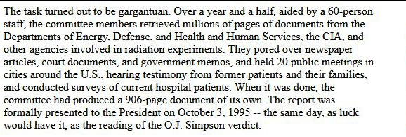 The OJ Simpson Connection: Why Didn't We Hear About Some Of This? In 1995, a group was mandated through John Hopkins University to report just on the nuclear experiments that were conducted illegally in the United States. On October 3, 1995, they handed their 906 pages of findings over to the President. On the same day, the OJ Simpson trial verdict came in. The story was buried. "The task turned out to be gargantuan. Over a year and a half, aided by a 60-person staff, the committee members retrieved millions of pages of documents from the Departments of Energy, Defense, and Health and Human Services, the CIA, and other agencies involved in radiation experiments. They pored over newspaper articles, court documents, and government memos, and held 20 public meetings in cities around the U.S., hearing testimony from former patients and their families, and conducted surveys of current hospital patients. When it was done, the committee had produced a 906-page document of its own. The report was formally presented to the President on October 3, 1995 -- the same day, as luck would have it, as the reading of the O.J. Simpson verdict." This was just one report on one type of test being illegally done on United States citizens - nuclear. They didnβt look into biological testing, chemical testing, etc. web.archive.org/web/2013011000β¦
