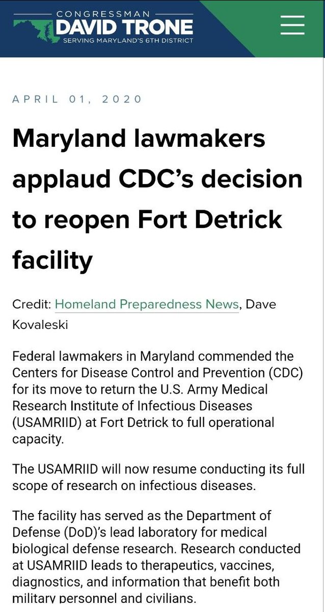 Shortly after, the facility quietly reopened in 2020... just a few months after it had shut down. https://trone.house.gov/2020/04/01/maryland-lawmakers-applaud-cdc-s-decision-reopen-fort-detrick-facility/