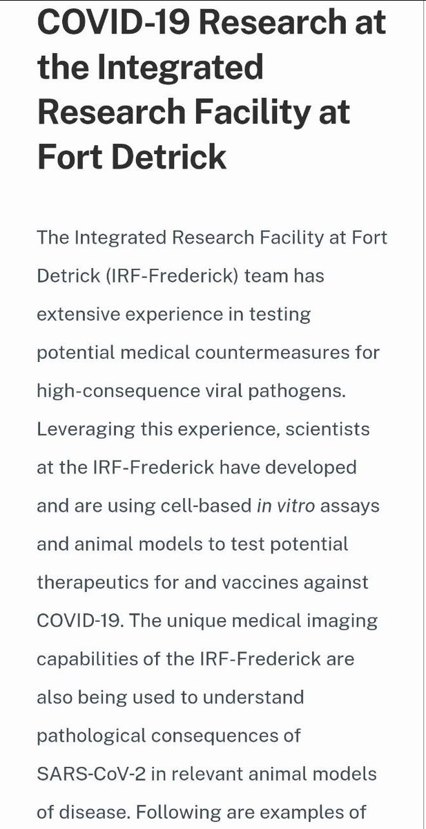 The Covid Vaccine Connection In 2019, Fort Detrick was shut down due to security and containment issues by the CDC. "The CDC inspection findings, obtained by the Frederick News-Post and published by the paper in redacted form in November, said the lab had 'systematically failed to ensure implementation of biosafety and containment procedures commensurate with the risks' of working with pathogens like Ebola, smallpox and plague." https://rollcall.com/2020/03/26/army-lab-fights-coronavirus-and-its-own-demons/