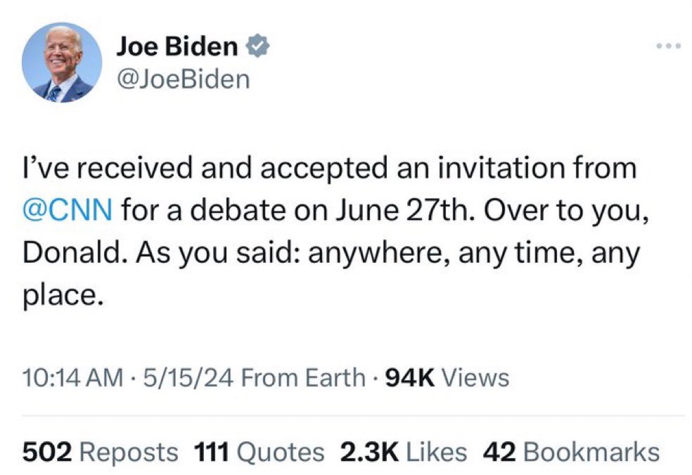 Joe, you should debate Trump on 𝕏. Moderated by Tucker Carlson and Joe Rogan. That way you can’t be spoon fed by CNN. Thoughts? https://t.co/eAORc3ga1h