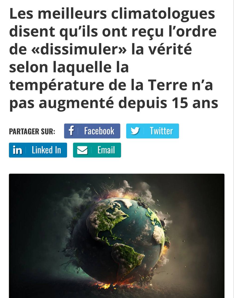 Le Groupe d’experts intergouvernemental sur l’évolution du climat (GIEC) à l’ONU a compilé un rapport faisant autorité sur l’ampleur du réchauffement climatique d’origine humaine. Et selon une fuite, cela montre apparemment que les températures mondiales n’ont pas augmenté depuis 15 ans. Les centaines de scientifiques estimés qui ont travaillé sur le rapport ont confirmé que 1998 est toujours l’année la plus chaude jamais enregistrée. Depuis lors, les températures sont généralement restées les mêmes ou ont diminué, creusant des trous majeurs dans le discours du gouvernement sur le réchauffement climatique. Les politiciens qui ont obtenu une copie divulguée du rapport tentent maintenant de dissimuler le fait que, sur la base de ses conclusions, le changement climatique d’origine humaine est un canular. Une fois que la vérité sortira, tout ce que les gouvernements font pour passer au «vert» sera également exposé comme rien de plus qu’une prise de pouvoir. https://reseauinternational.net/les-meilleurs-climatologues-disent-quils-ont-recu-lordre-de-dissimuler-la-verite-selon-laquelle-la-temperature-de-la-terre-na-pas-augmente-depuis-15-ans/