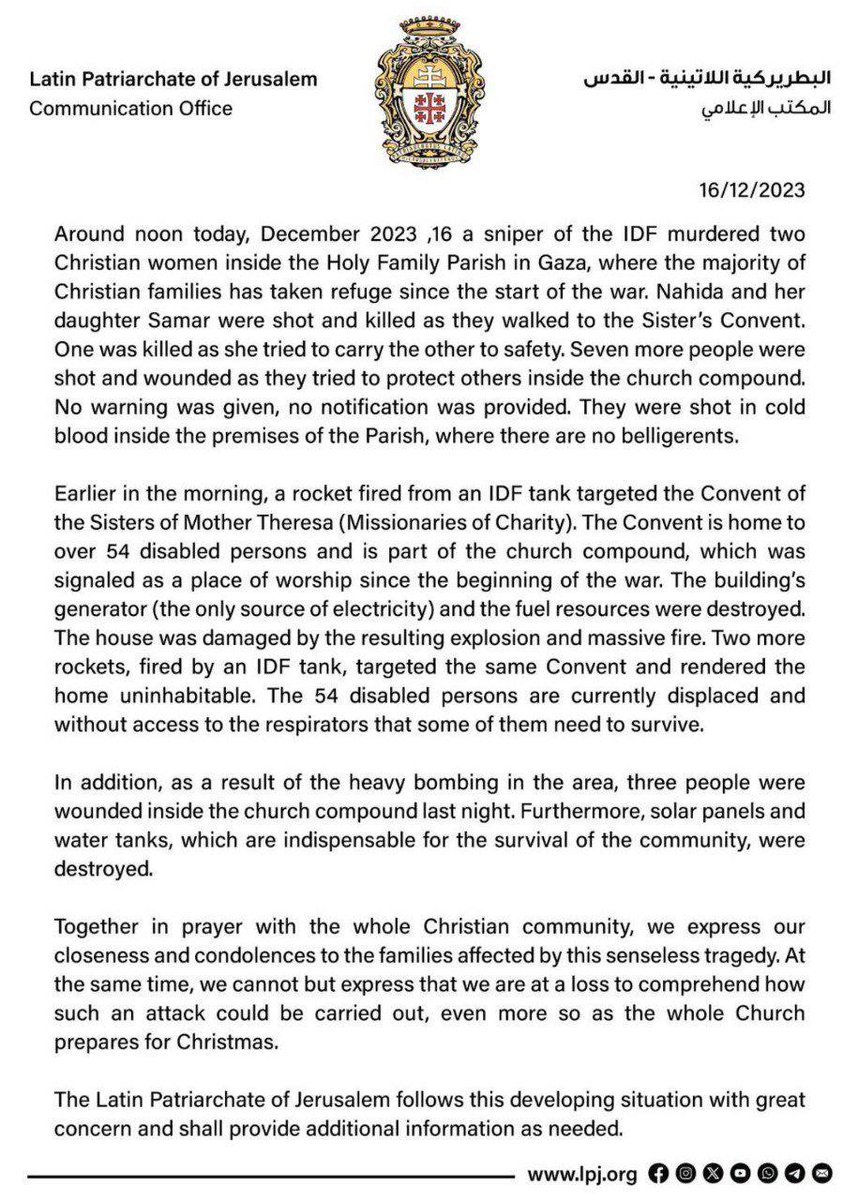 Communiqué du Patriarcat Latin de Jérusalem : "L’armée d’occupation israélienne a abattu deux paroissiennes qui se sont réfugiées dans l’Eglise de la Sainte Famille à Gaza et a blessé 7 autres membres de la communauté chrétienne qui leur sont venus en aide." "Plus tôt dans la matinée, un tank israélien a tiré une roquette sur le Couvent des Sœurs de Mère Teresa qui accueille 54 pensionnaires handicapés."