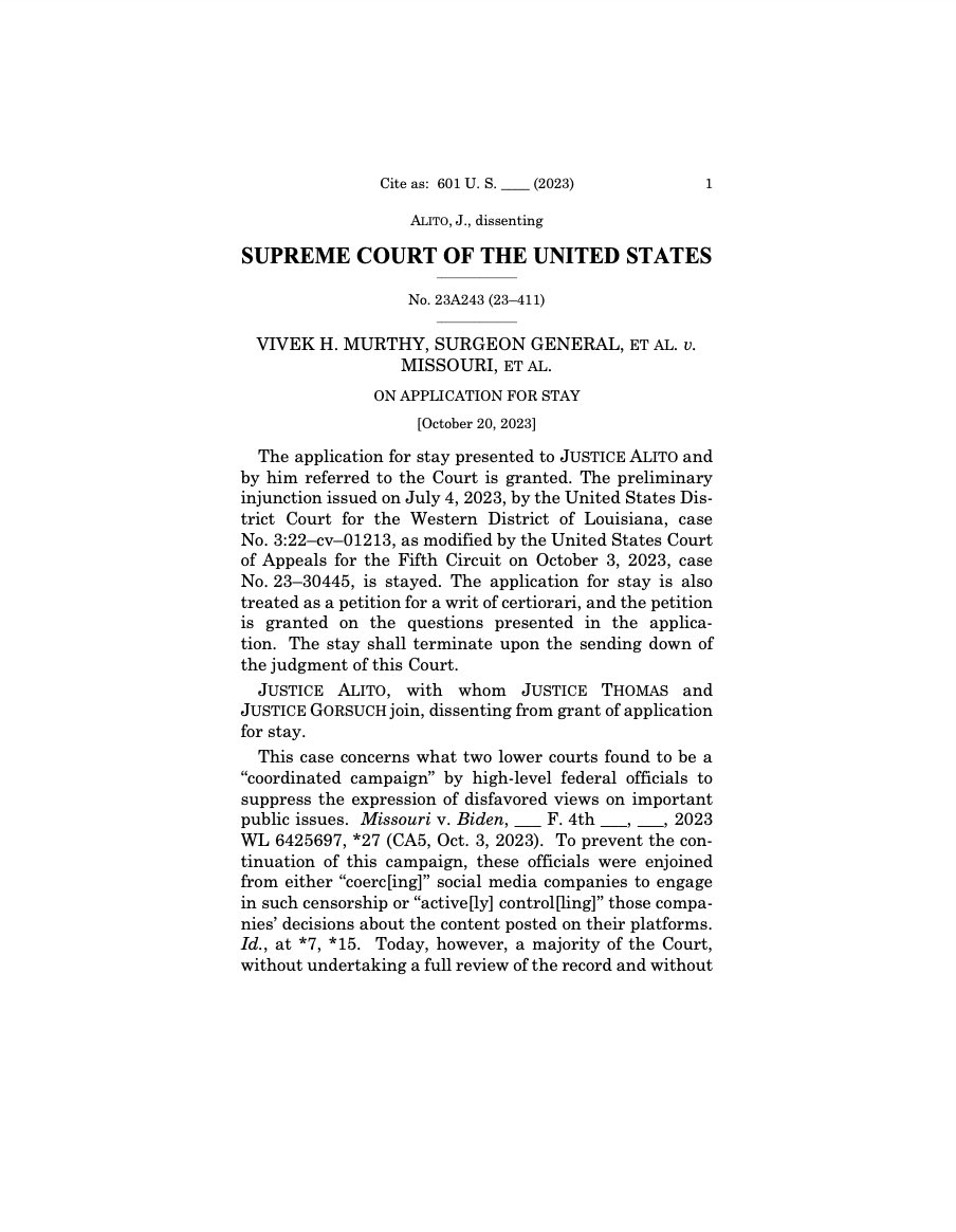 🚨 BREAKING: The United States Supreme Court has granted cert in Missouri v. Biden -- the nation's highest court will hear the most important free speech case in American history. I'm proud to have filed this case when I was AG, and will always defend free speech. https://t.co/2MOfLXH8u0