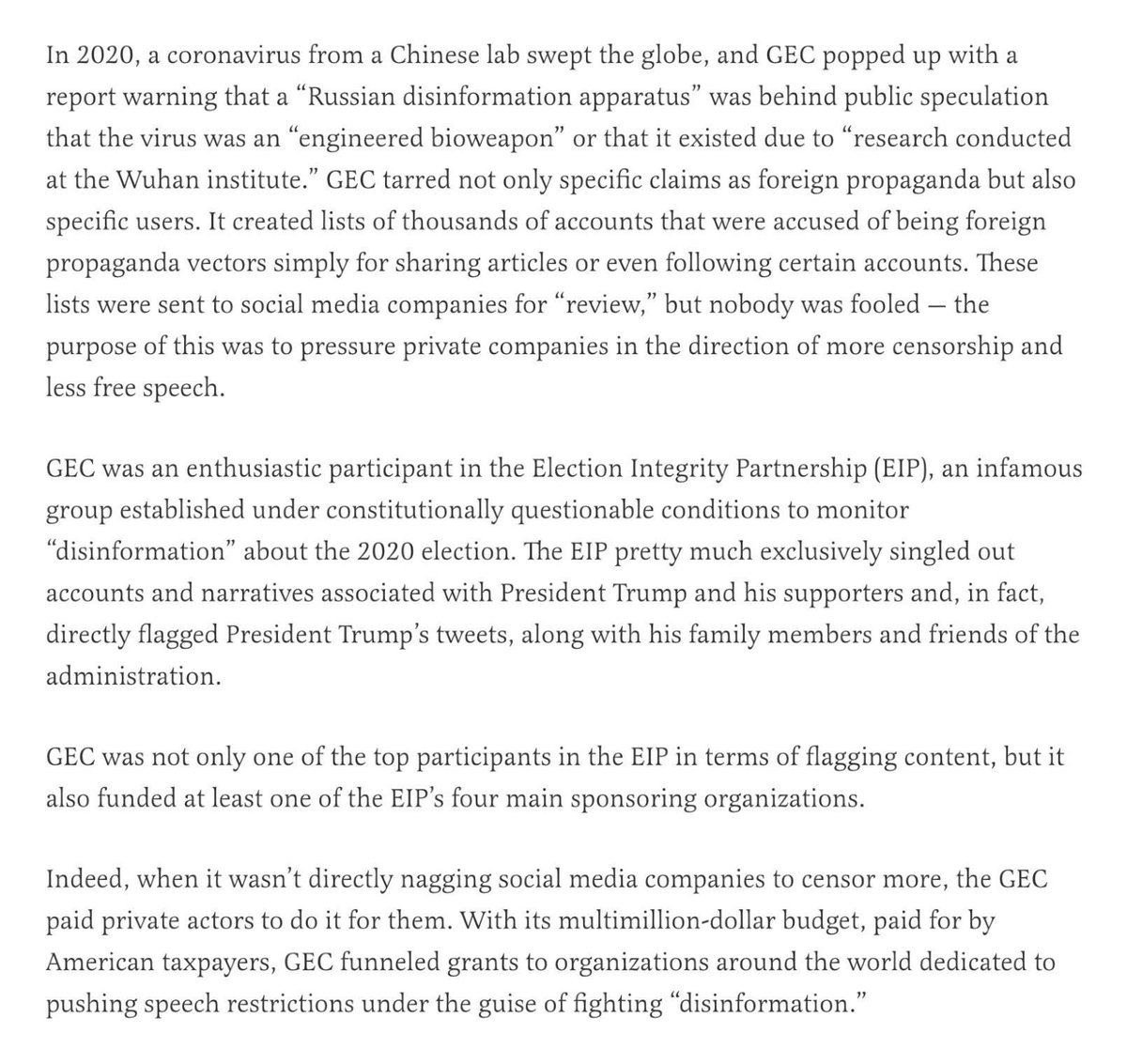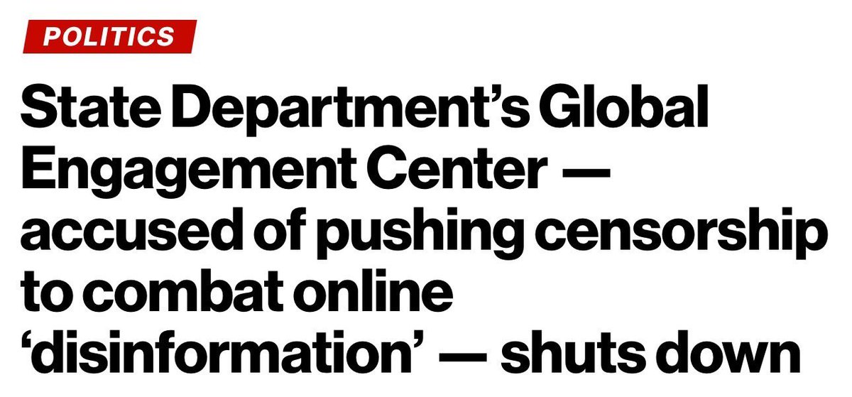 One of the nerve centers of this censorship machine was the State Department's Global Engagement Center (GEC). Founded under Obama, the GEC was originally billed as a way to combat FOREIGN propaganda. But it began to target Americans—under the guise of fighting "disinformation." https://t.co/i8LTeUKzcB